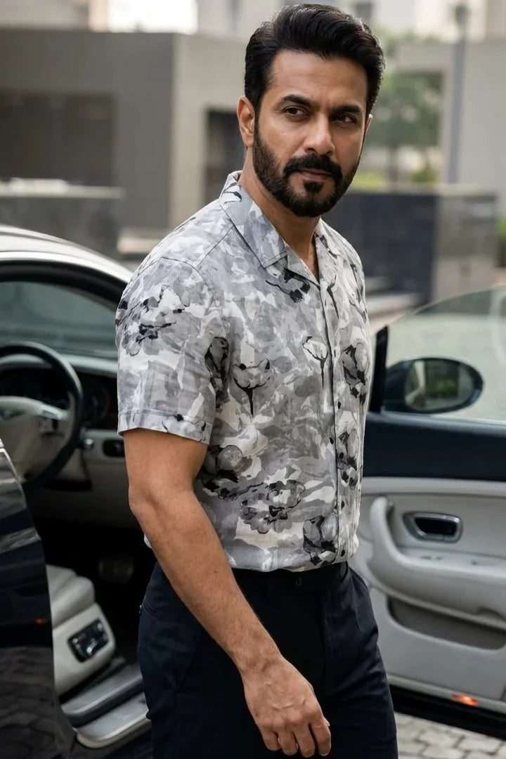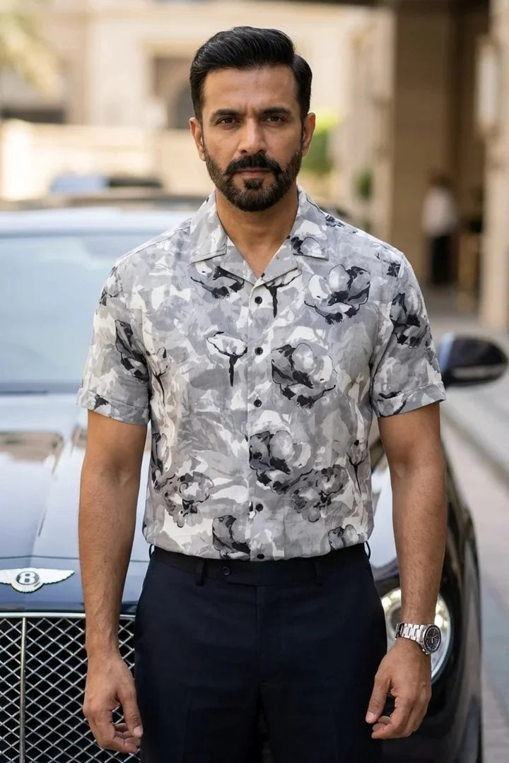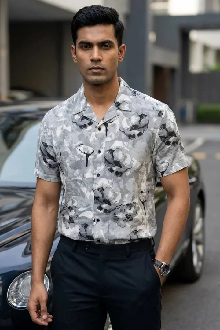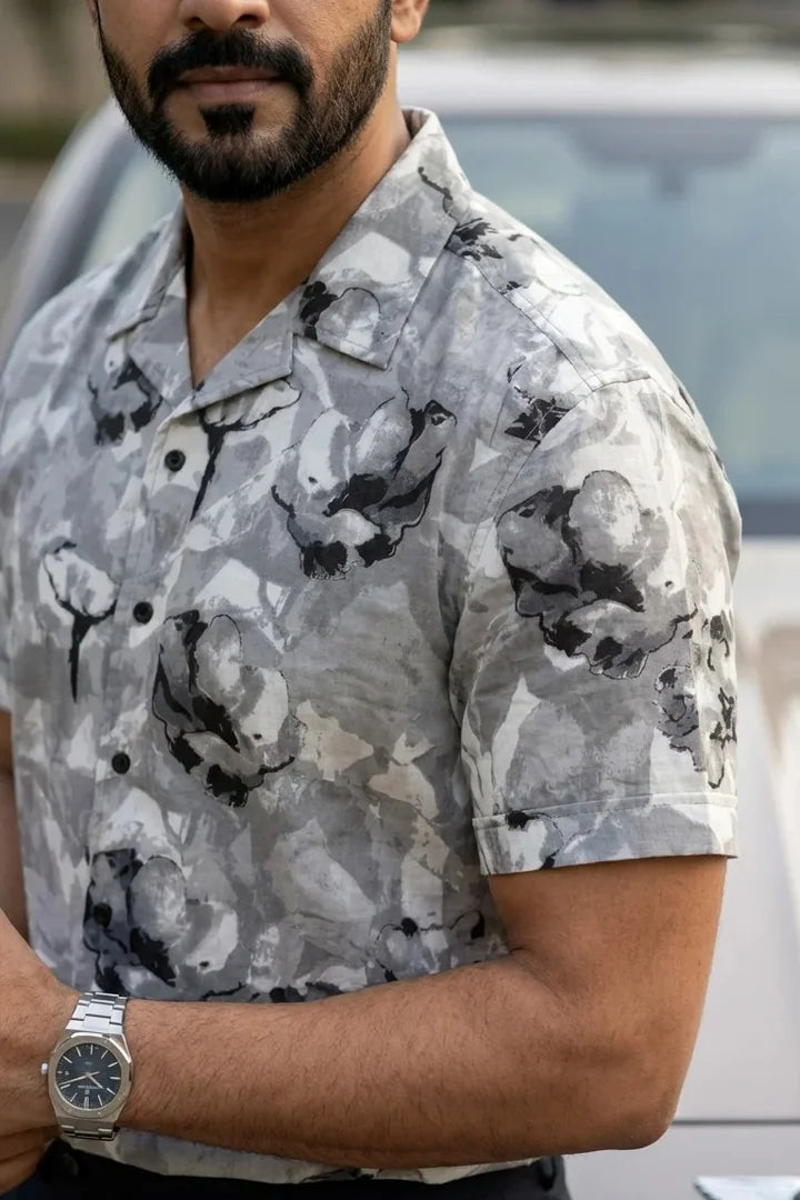 Aaru - Water Splash Effect - Floral - Grey & Black Cuban Collar - Short Sleeve Shirt - This water-paint effect men’s premium half-sleeve shirt is crafted from soft, durable cotton flex and tailored with premium fabric for all-day comfort. The subtle hues of grey blend effortlessly, creating a sophisticated and versatile look that complements all skin tones. Designed specifically for men, these shirts adapt seamlessly to both formal and relaxed settings, offering effortless style and refined elegance for every occasion.