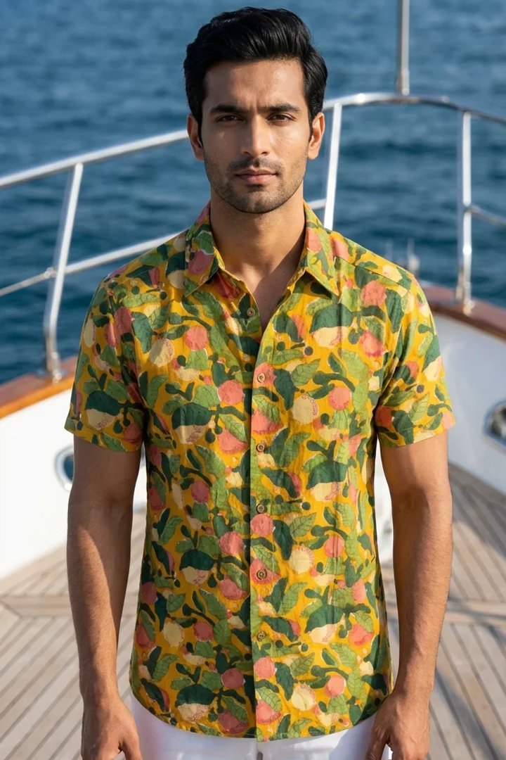 Phoola – Sanganeri - Yellow - Fruit & Leaves - Short Sleeve Shirt - Sanganeri is a men’s premium half-sleeve shirt, meticulously handmade from 100% breathable cotton and crafted with premium fabric for lasting comfort. Each Sanganeri motif is hand-stamped and hand-dyed, perfected over generations to reflect Rajasthan’s timeless artistry. Designed to drape elegantly on men, this shirt moves effortlessly across every occasion—formal or casual—blending heritage, refined craftsmanship, and contemporary style in every stitch.